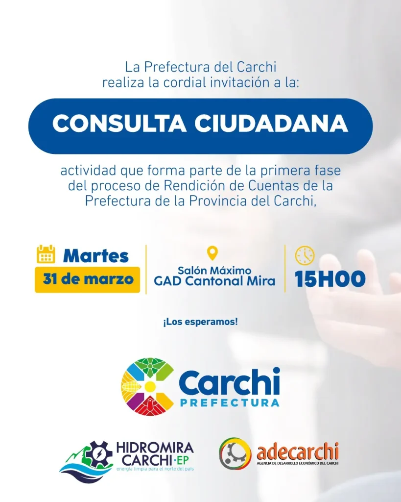 Consulta Ciudadana LA PREFECTURA DEL CARCHI Tiene el honor de invitar a usted a la: CONSULTA CIUDADANA 2025 Este espacio es fundamental dentro de la primera fase del proceso de Rendición de Cuentas de la Prefectura de la Provincia del Carchi. Su participación es clave para fortalecer la transparencia y el desarrollo de nuestro territorio. […]